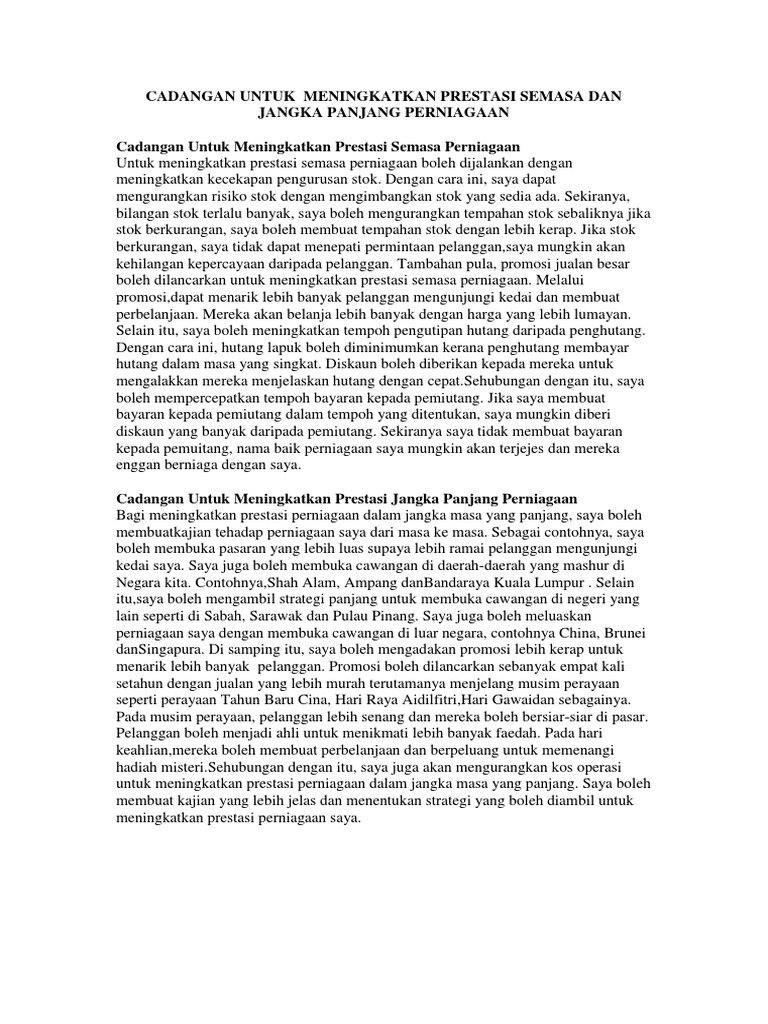 Top Pdf Meningkatkan Prestasi from data03.123doks.com Terdapat beberapa kaedah untuk meningkatkan kualiti perkhidmatan dalam perniagaan anda, daripada mempunyai tujuan yang jelas dan dikira dengan jelas dan memotivasi pekerja anda untuk menggunakan maklum balas pelanggan dan mengemas kini alat perkhidmatan anda untuk memberi. Cadangan untuk meningkatkan prestasi semasa perniagaan. Aset yang tahan lama dan kekal untuk beberapa tempoh perniagaan. Bila anda dihadapkan pada dua pilihan jangka waktu investasi, jangka waktu mana yang lebih anda utamakan? Cadangan untuk meningkatkan prestasi semasa dan jangka panjang perniagaan. Investasi jangka panjang memiliki potensi keuntungan yang cukup besar dan diharapkan kelak bisa menjadi sumber penghasilan tetap di dalam keuangan. Dibandingkan dengan investasi jangka panjang, investasi jangka pendek biasanya tidak membutuhkan banyak analisis. Utang jangka panjang umumnya digunakan untuk memperkuat posisi modal perusahaan.